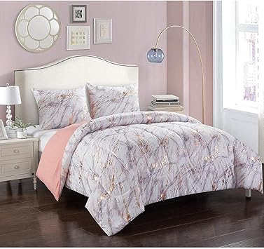 The 2 matching shams (1 in twin/twinxl) gold comforter set. Designed in a rose gold metallic hue.